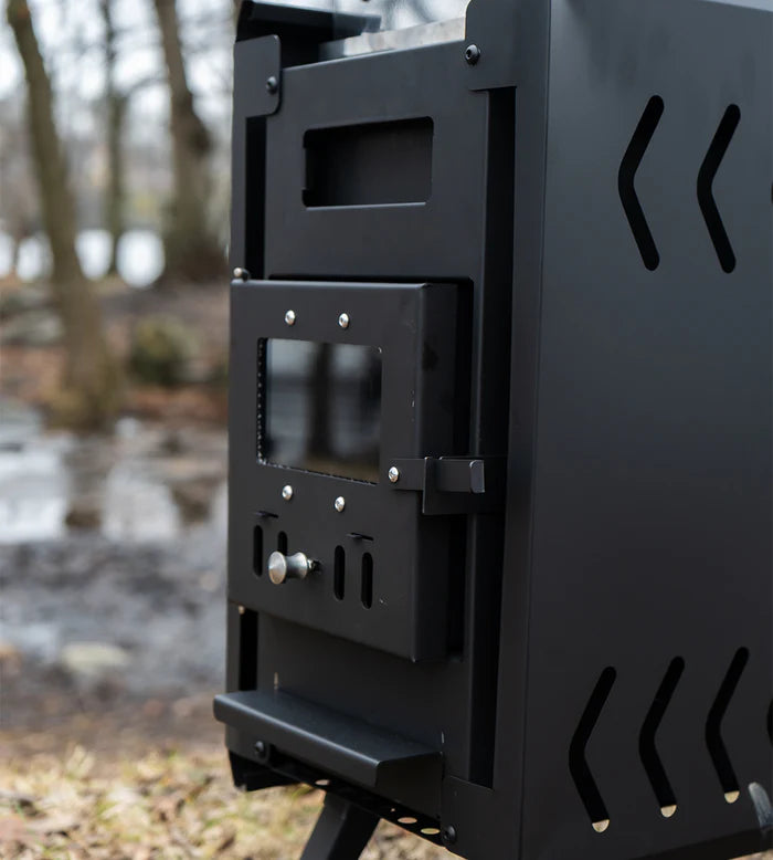 Ta med ovnen, brett ut bena og monter pipen – så er det bare å fyre opp.