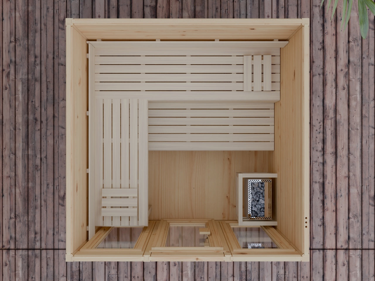 3-seters layout i spesialutvalgt mykt treverk. Kvistfri, harpiksfri, lav varmeledning. Inkluderer 2–3 benker, flyttbar underbenk, 1–2 ryggstøtter, 1–2 nakkestøtter, 1 benkepanel, 1 ovnsvern og 1 badstuskjerm med ramme.