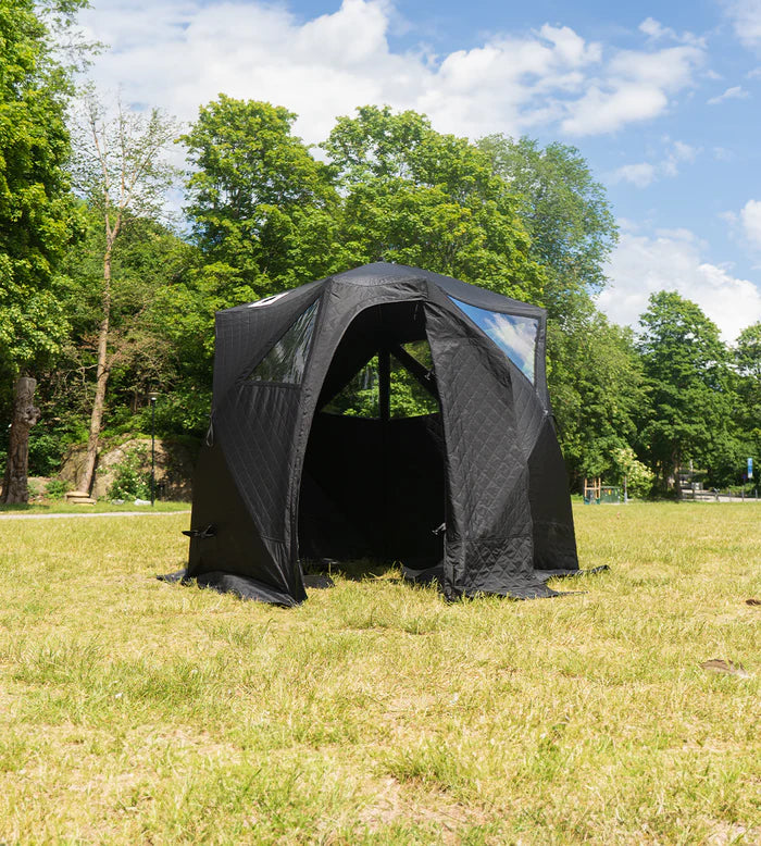 Den vedfyrte ovnen gir rask oppvarming og en autentisk badstuopplevelse. Badstuteltet er lett å montere og kan settes opp hvor som helst – uten behov for byggetillatelse. Designet for nordisk klima, slik at du kan nyte badstu året rundt!