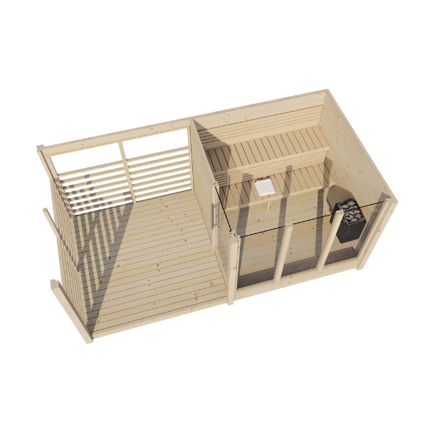Anita med terrasse er en moderne badstu med tilhørende terrasse, perfekt for deg som ønsker en alt-i-ett løsning ute. Den kombinerer en romslig badstu (ca. 2 meter) med en åpen terrasse (ca. 2 meter), ideell for plassering av utemøbler eller et lite boblebad. Badstuen har plass til 2–4 personer og leveres som byggesett som er enkelt å montere. Front og inngangsdør leveres i herdet glass som gir et elegant og lyst uttrykk.